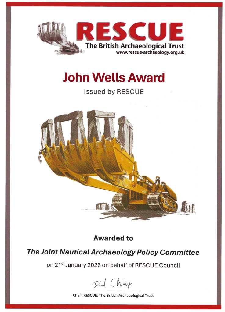 In January 2026 the Joint Nautical Archaeology Policy Committee (JNAPC) received the first John Wells Award from RESCUE, the British Archaeological Trust.
